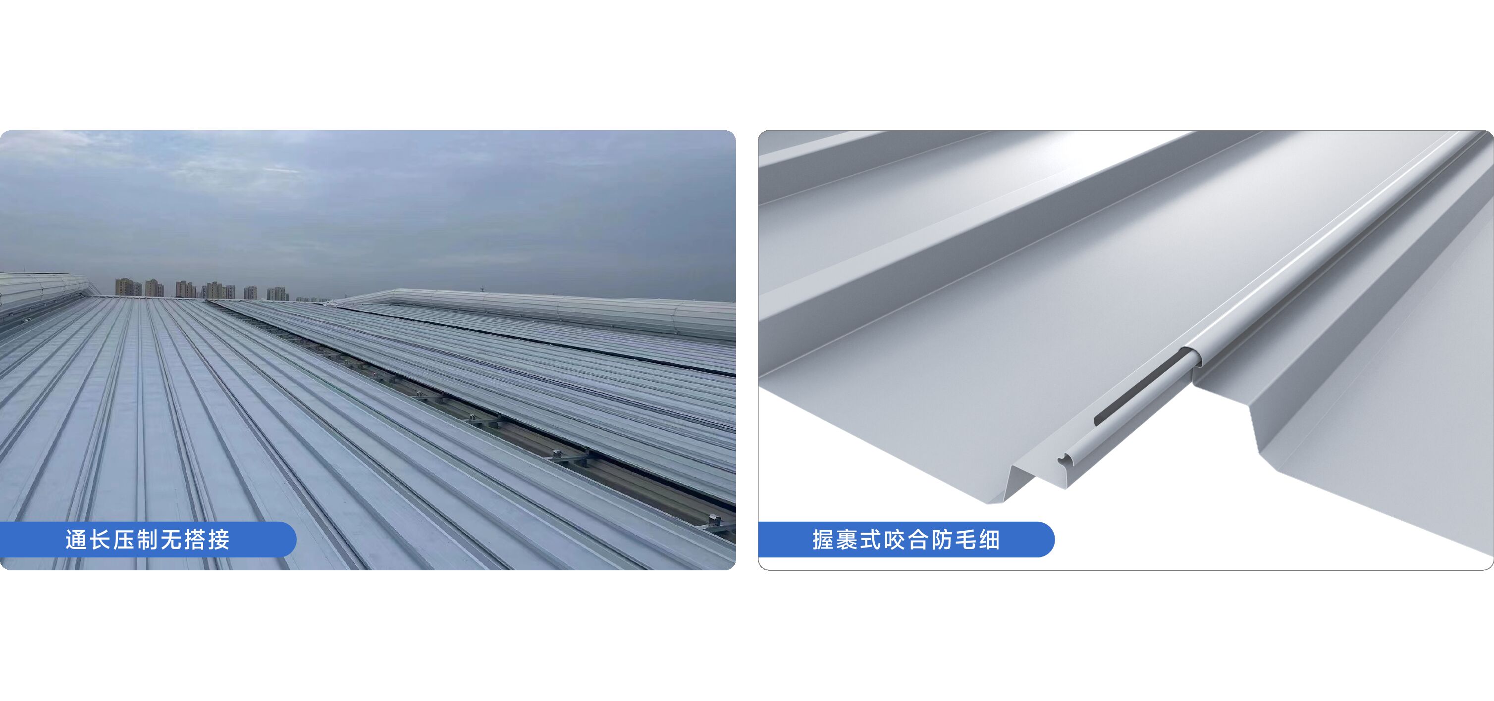 创新设计的无搭接、无滑动、握裹式咬合屋面系统。