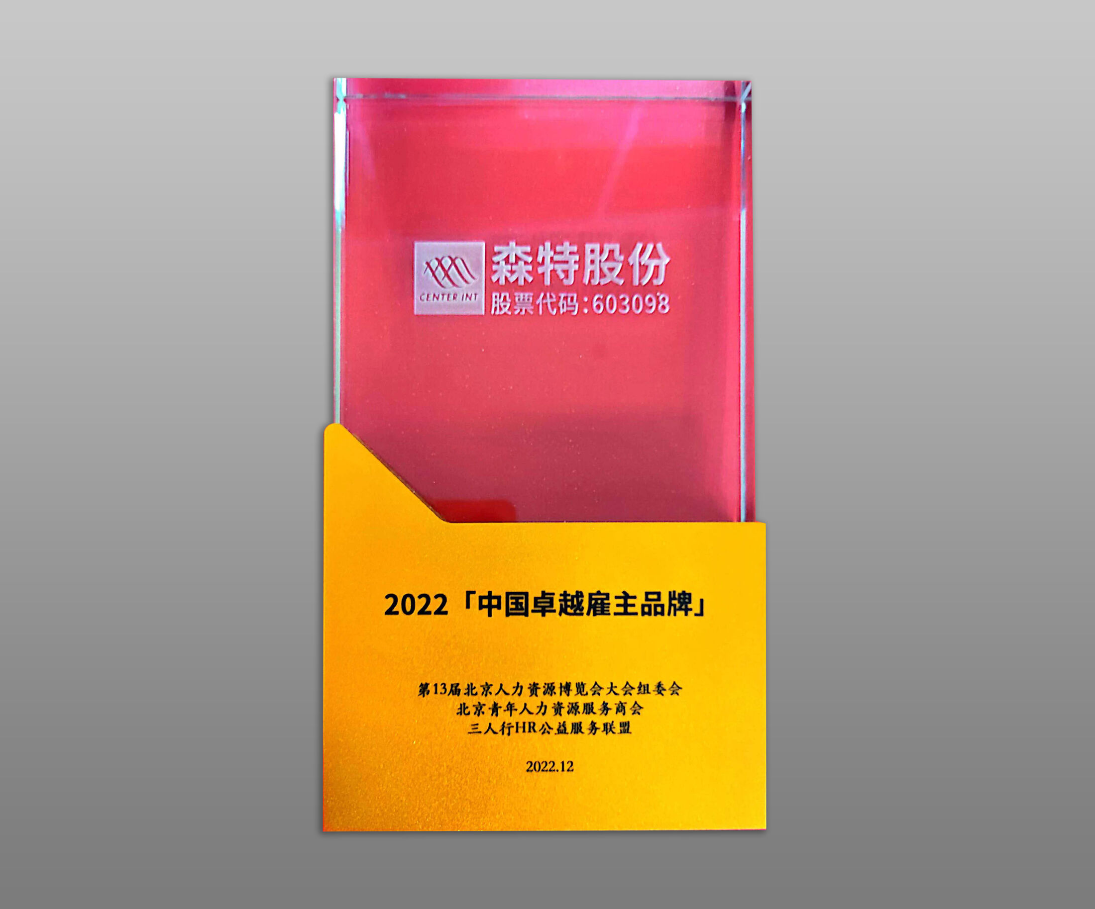 2022年12月21日, 第十三届中国(北京)人力资源博览会暨2022HR年终盛典在京盛大召开,会上隆重颁发了“2022《中国卓越雇主品牌》”奖。 森特股份经过评选荣获2022年中国卓越雇主品牌之一。